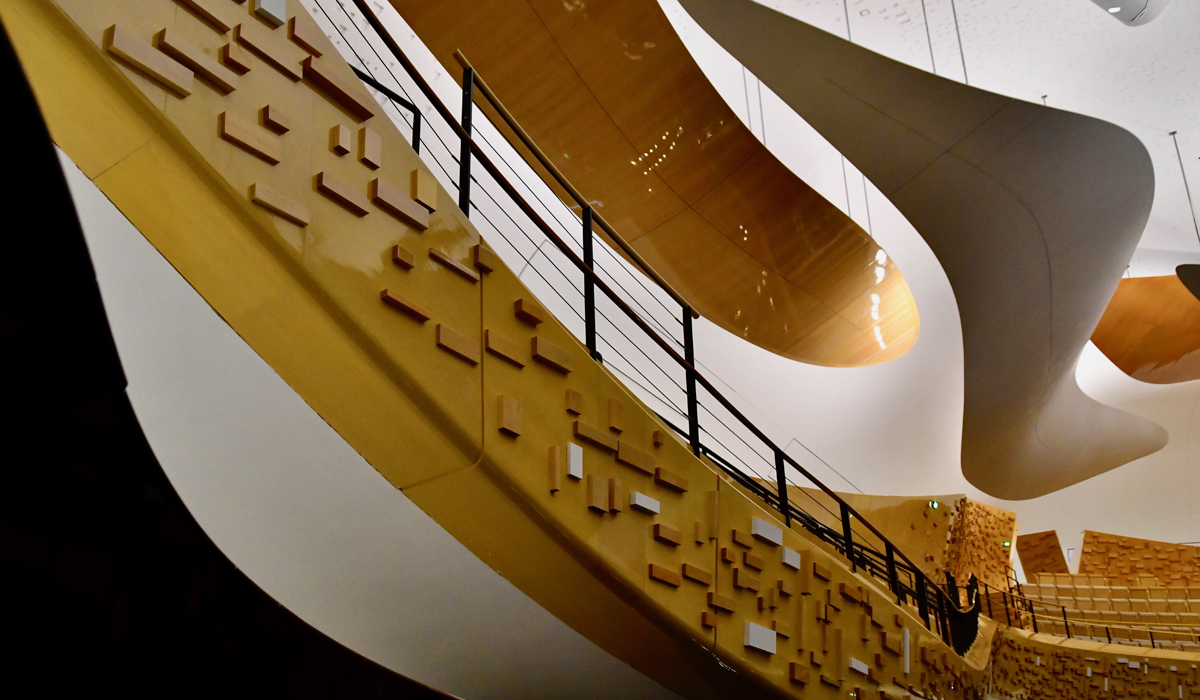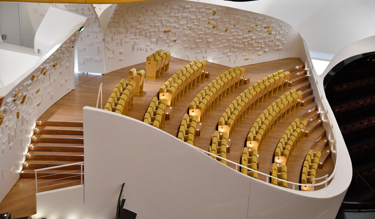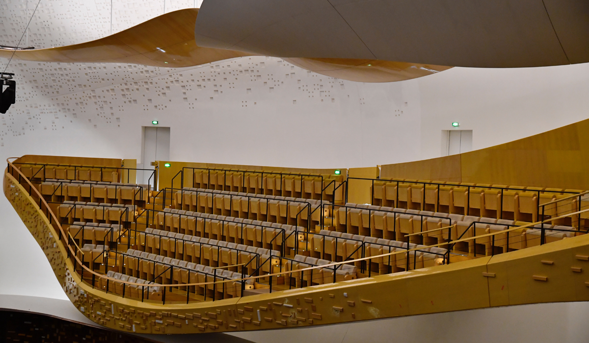 Réalisations des habillages muraux, balcons, et nuages au plafond en panneaux plaqués érable véritable, finitions vernis haut brillant et laque. Portes monumentales d’accès à la grande salle, habillages des salles de répétitions, mobiliers d’accueil, bar et vestiaires.